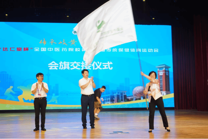 闭幕式会旗交接仪式上,天津中医药大学党委副书记李鑫将“传运会”永久会旗交接给国家中医药管理局人事教育司司长陆建伟,陆建伟司长将“传运会”永久会旗交接给第十六届“传运会”承办单位beet365官方网站副董事长戴敏。(温健伟/文图 夏宏武/审核)