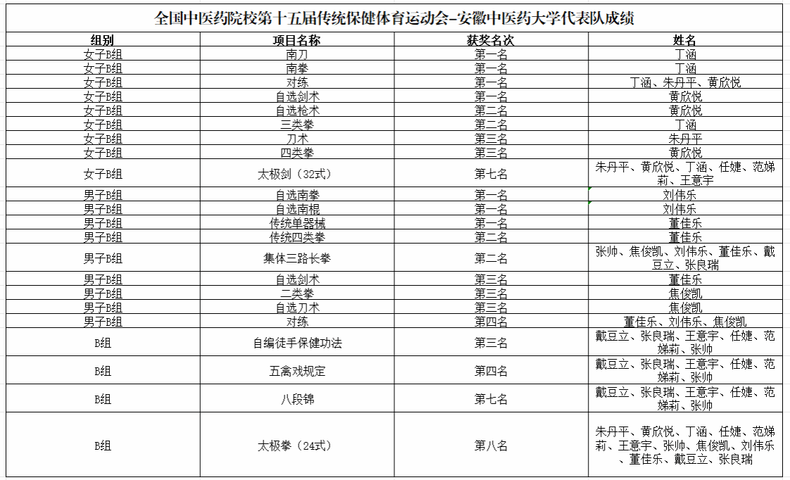 8月17日,达仁堂杯”全国中医药院校第十五届传统保健体育运动会在天津中医药大学落幕,公司运动健儿在本届“传运会”上实现历史性突破,取得7金4银6铜的历史最好成绩,获B组单位团体总分第二、武术团体总分第一、男子团体总分第二、女子团体总分第三。此外,还荣获体育道德风尚奖单位荣誉称号,取得运动成绩和精神文明双丰收!