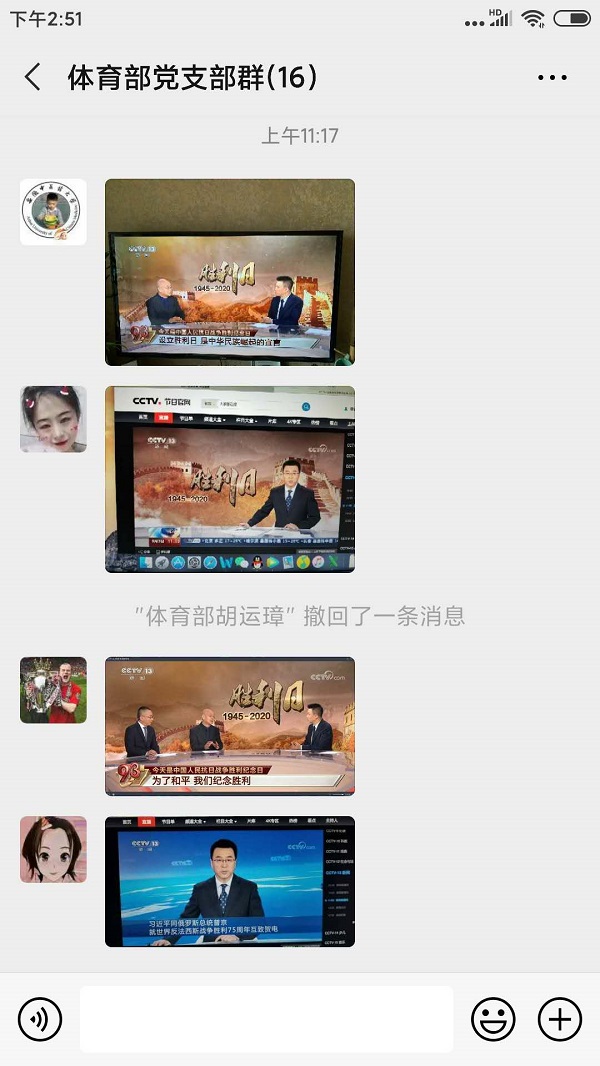 9月3日上午,体育部直属党支部积极组织教师收看中国人民抗日战争暨世界反法西斯战争胜利75周年向抗战烈士敬献花篮仪式。重温中华民族不屈不挠、英勇抗战的伟大精神。那一声声号角触动了我们的心灵,那威严的脚步激励着我们前行,那一篮篮鲜花让我们对民族英雄致敬,我们要铭记历史缅怀先烈,珍爱和平开创未来。