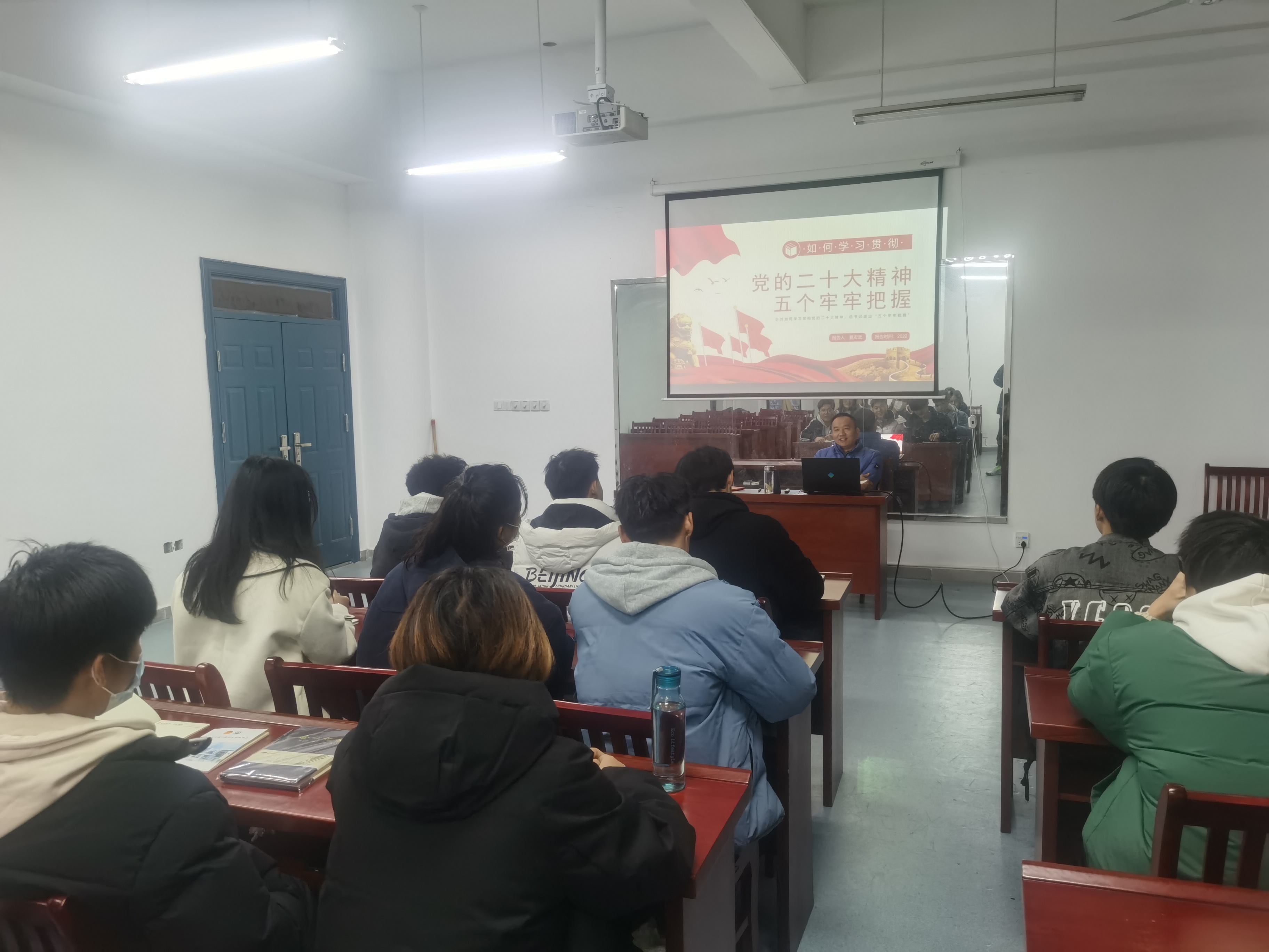 宣讲会上,夏宏武以“牢牢把握这个重大意义”、“牢牢把握这个世界观与方法论”、“牢牢把握这个使命任务”、“牢牢把握这个重要要求”、“牢牢把握这个时代要求”这五个小标题为,深入带领同学们了解了党的二十大相关会议内容和精神。会上,夏宏武用提问的方式拉近了和同学们的距离,同时也提高了同学们的参与度,使同学们对党的二十大工作与相关精神有了更加深刻的领悟。
