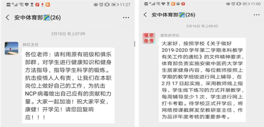 疫情就是命令,防控就是责任。体育部提前布置,精心组织谋划,制定《beet365官方网站员工居家健身计划》,2月17日,各体育俱乐部老师们充分利用微信群、PPT、QQ、iMovie、学习通等软件,制定计划、视频教学、交流解答等方式来进行实施,对员工进行网上健康知识和健康方法指导互动。坚定信心,共待春来!虽然疫情暂时阻挡了师生们的回校脚步,但“停课不停学”让我们继续向前,一定能够打赢这场疫情防控的战争。